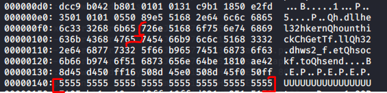 Note the sequence filled with "55555..." - this is the one that , once overwritten with "555..." allowed me free download.  Then I tried to determine what is so special about the original byte sequence that justified its selection as a malicious indicator. Initial search results pointed out to another piece of slammer worm that seemed to be used as a signature in a number of IDS/IPS and is outlined below. (The example post below suggested Snort signature targets the following bytes)